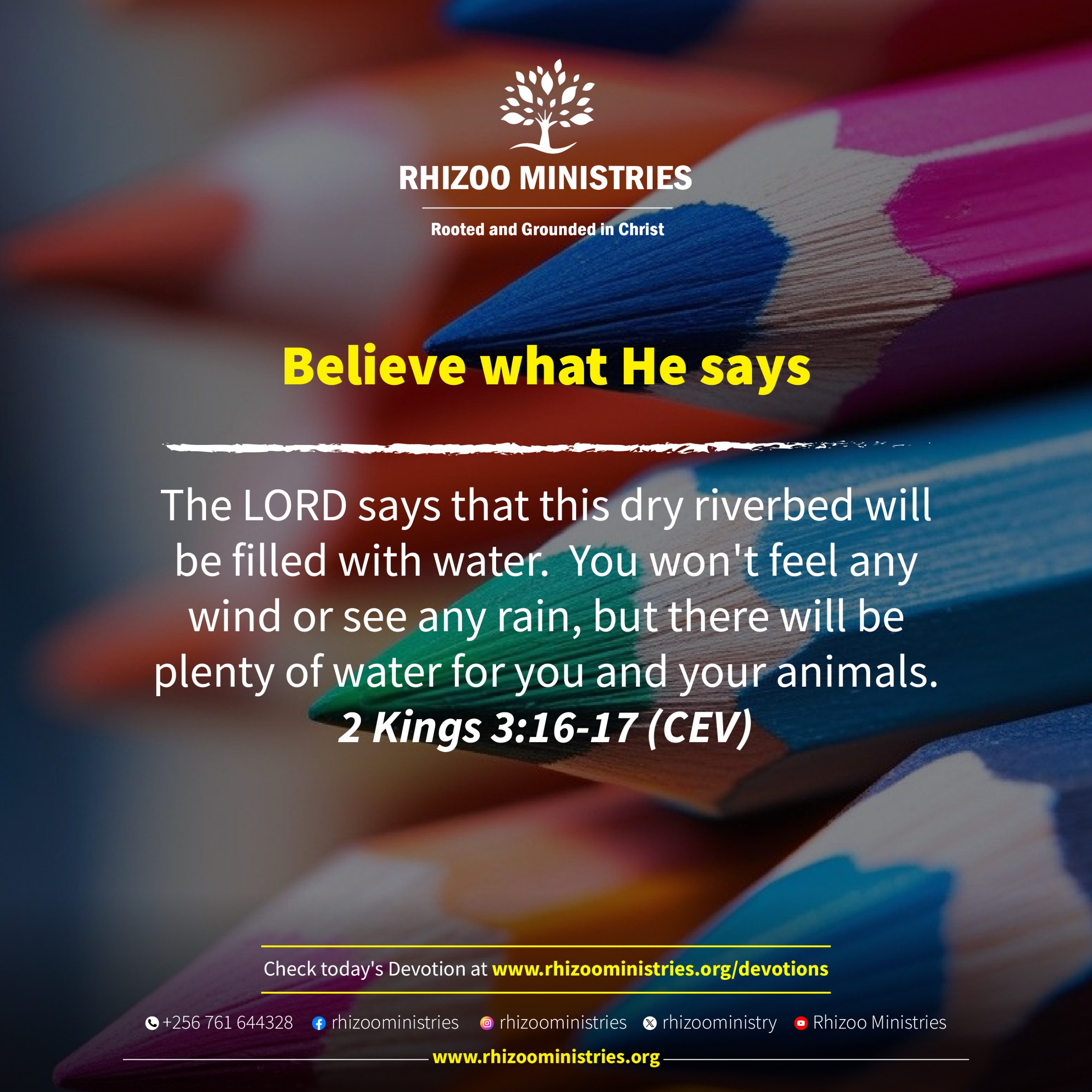 The LORD says that this dry riverbed will be filled with water. You won’t feel any wind or see any rain, but there will be plenty of water for you and your animals. 2 Kings 3:16-17 (CEV)