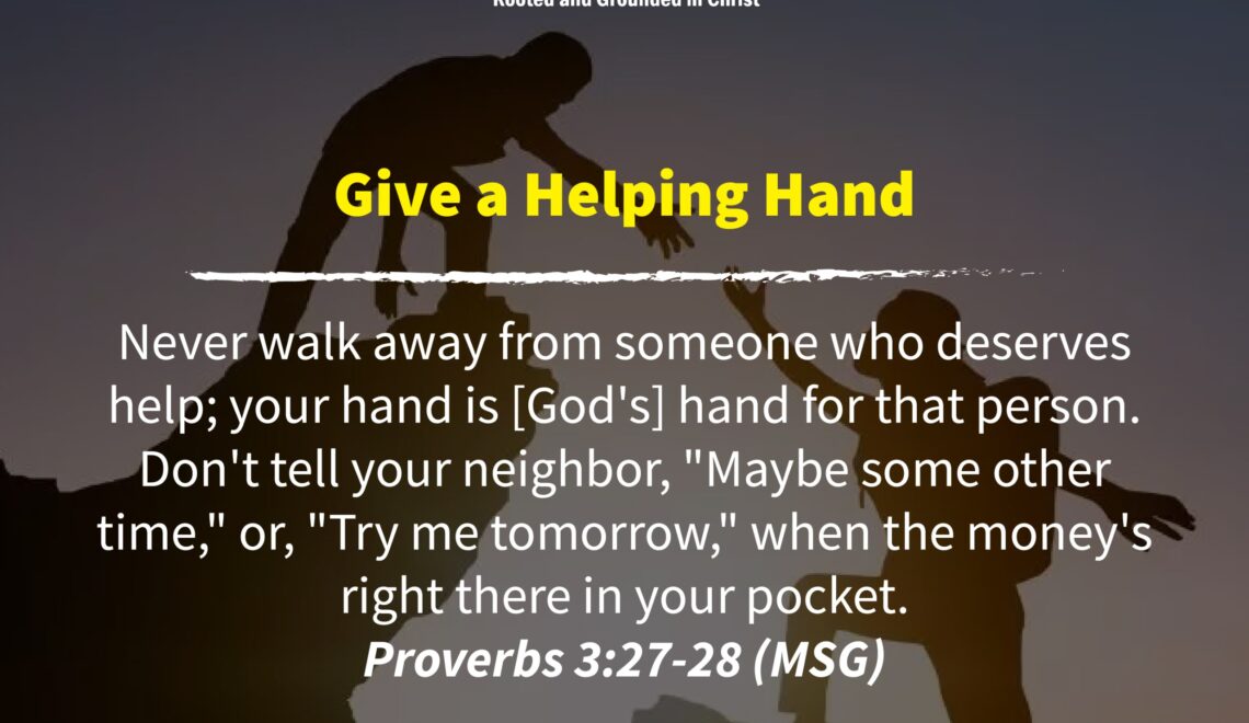 Proverbs 3:27-28 (MSG) Never walk away from someone who deserves help; your hand is [God’s] hand for that person. Don’t tell your neighbor, “Maybe some other time,” or, “Try me