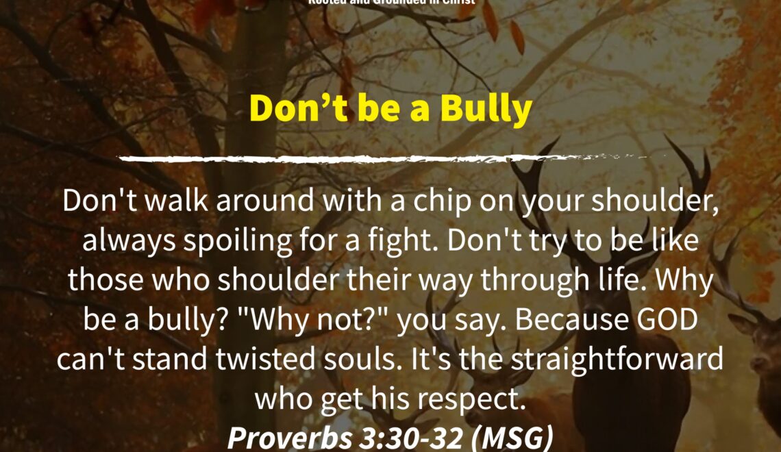 Proverbs 3:30-32 (MSG) Don’t walk around with a chip on your shoulder, always spoiling for a fight. Don’t try to be like those who shoulder their way through life. Why