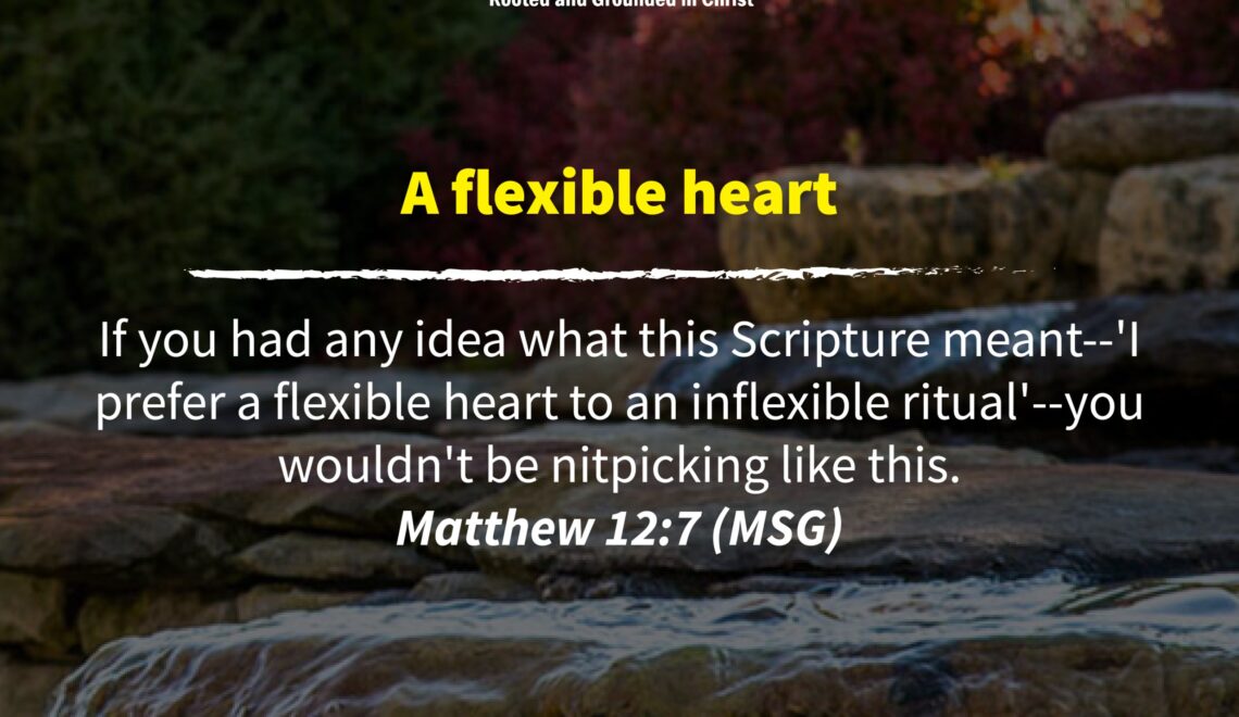 If you had any idea what this Scripture meant–‘I prefer a flexible heart to an inflexible ritual’–you wouldn’t be nitpicking like this. Matthew 12:7 (MSG) Imagine instructing your child that