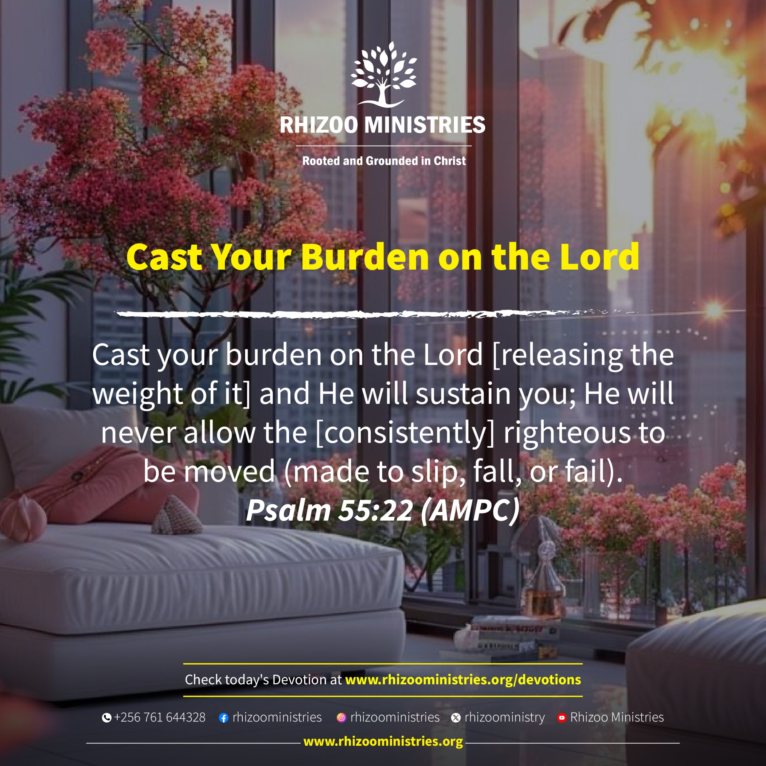 Burdens are concerns and worries we carry concerning issues and situations we can’t solve. The Lord commands us in His Word to cast all of these on Him. You can’t change or turn around anything by worrying about it. Actually, worry makes it even worse as it blinds you to any possibility and availability of help or a way out.Cast your burdens on the Lord by making known to Him all your concerns and requests through prayer.