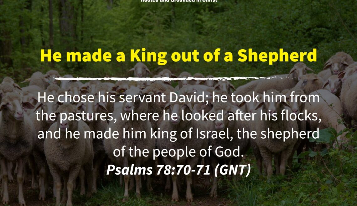 He chose his servant David; he took him from the pastures, where he looked after his flocks, and he made him king of Israel, the shepherd of the people of