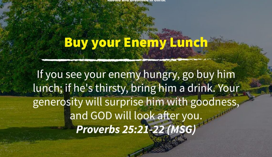 If you see your enemy hungry, go buy him lunch; if he’s thirsty, bring him a drink. Your generosity will surprise him with goodness, and GOD will look after you.
