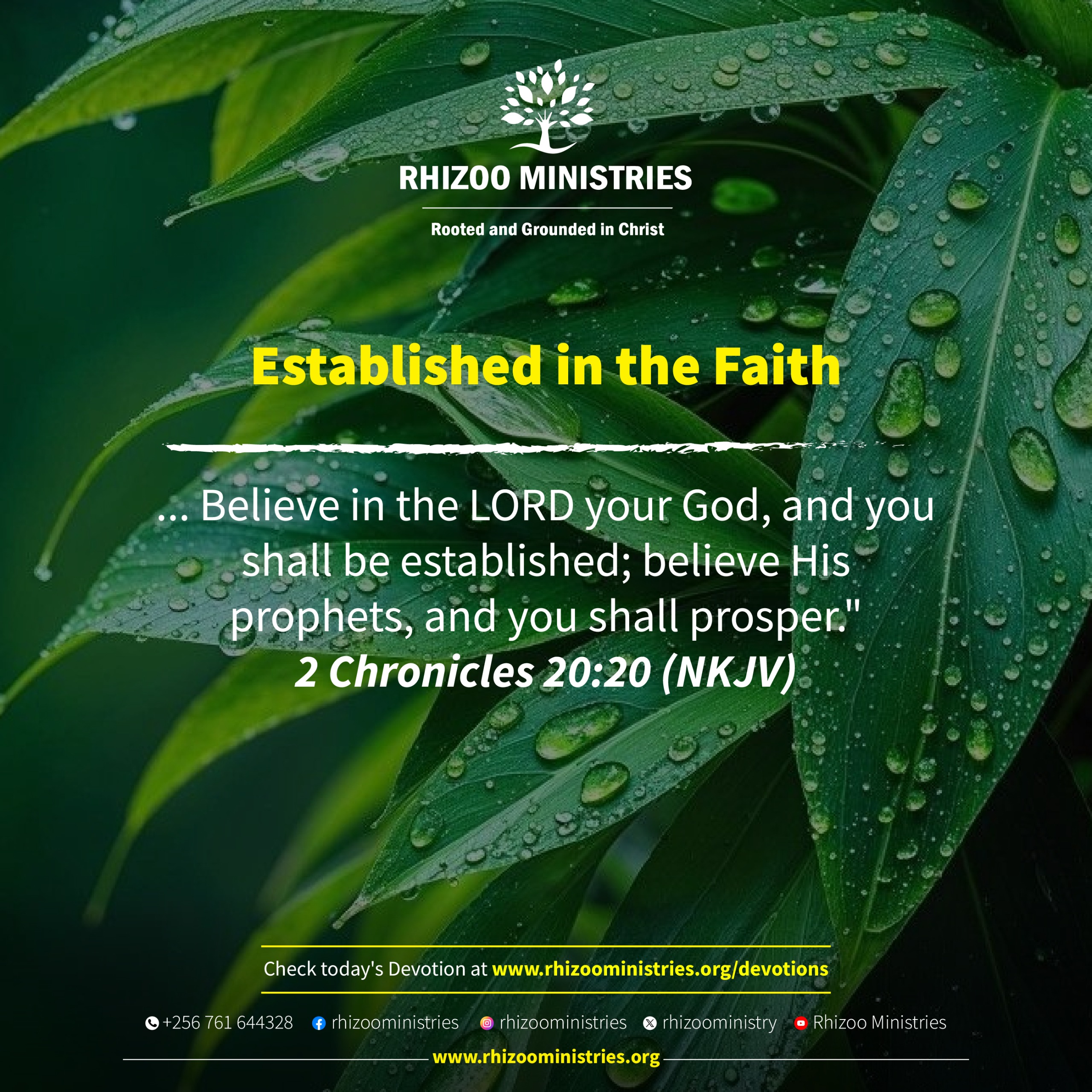 Established in the Faith is being fully persuaded of what you haven’t yet seen in the physical. Everything we see, feel, or can reason in the physical sense world came out of the unseen spirit world. The invisible God created all things in existence by Faith.Do not be discouraged, neither quit on what you set out to do and achieve that you haven’t yet realized. Be established in the Faith as you fill your, heart with the assuring truth of God’s Word that He is present, working, and causing your dream and vision not yet visible to come to fulfillment in the physical seen world.