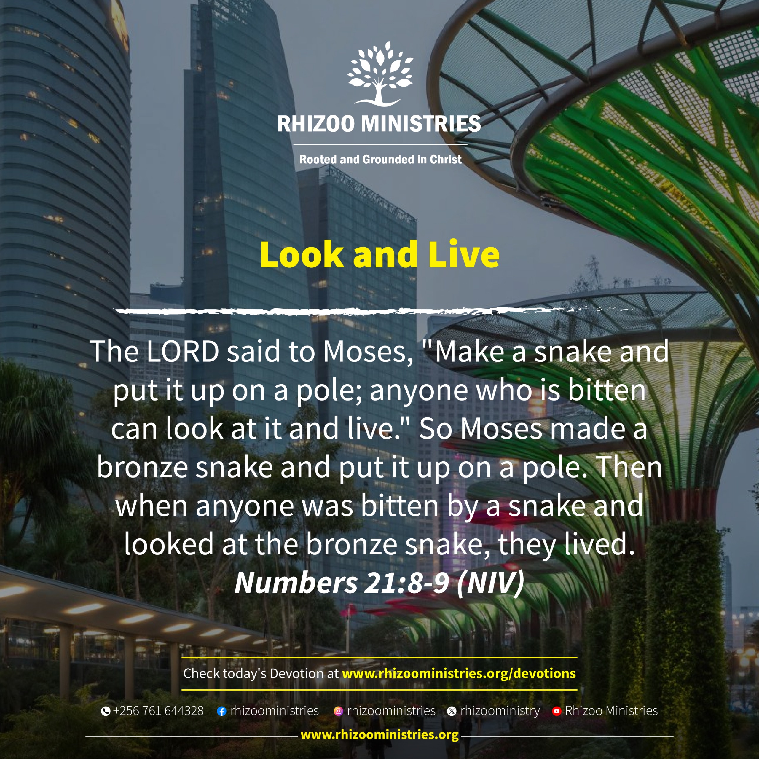 Under the law what is hung on a tree is cursed or judged and doomed to destruction. The bronze snake hung on a pole meant that the venom and the death from the snakes that bit the Israelites had been rendered powerless. By looking at that image, they were agreeing with what God was telling them so whoever did, lived.Today we have a better reality of Jesus who hung on a tree (Cross) as our sin bearer – John 3:14-15. As we look to Him believing all our sin was condemned, punished, and blotted out in Him, we can live forgiven, righteous, free and victorious.