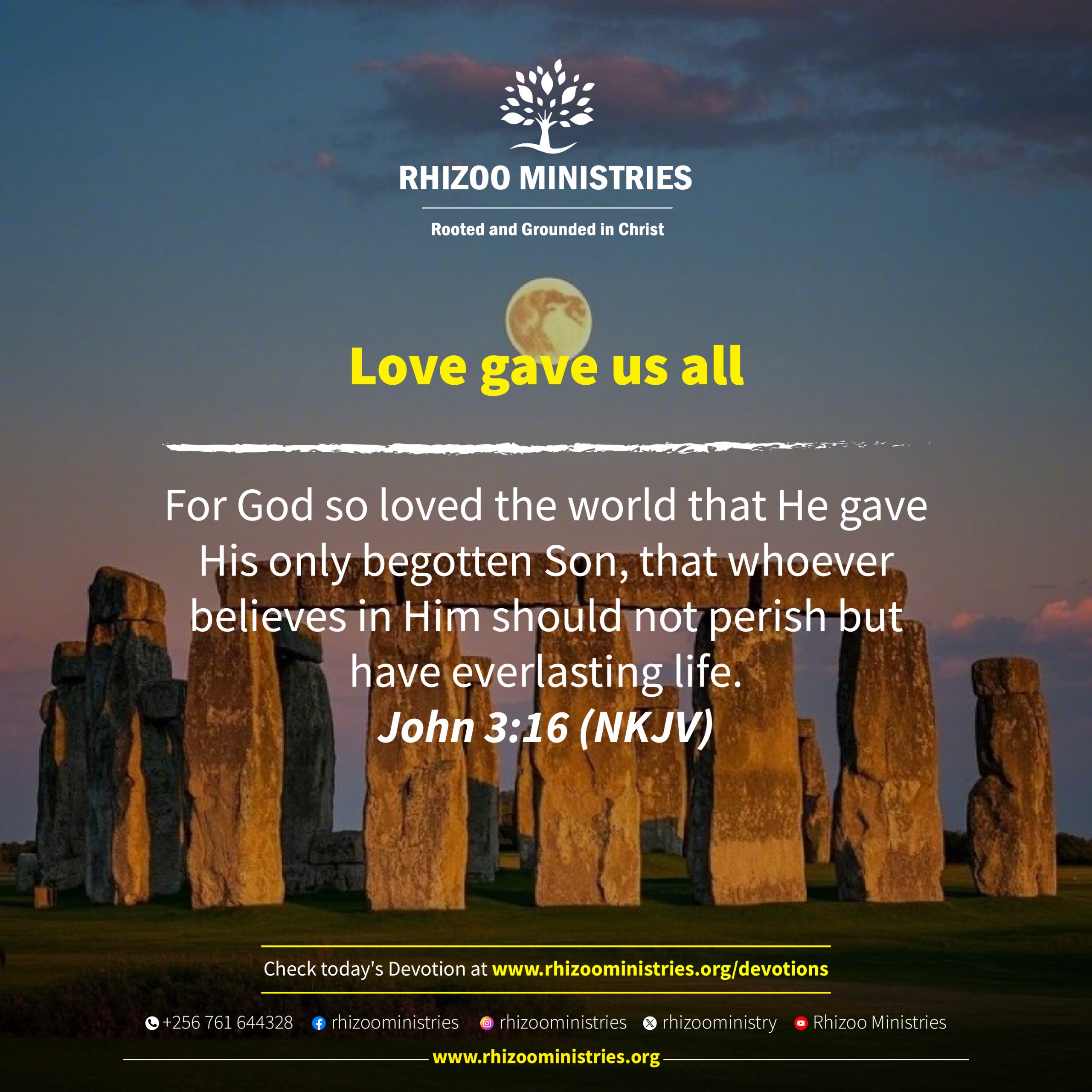 When God gave us His Son Jesus Christ to save us, He in essence gave us all things. Romans 8:32 asks “He who did not withhold His Son but gave Him up for us, shall He not also with Him freely give us all things? Yes, God has freely given us all things through His Son. He has blessed us with all spiritual blessings in Him – Ephesians 1:3. He has given us all things that pertain to life and godliness -2 Peter 1:3 God has given us His very Life when He gave us His son. – 1 John 4:12.Love gave us all.