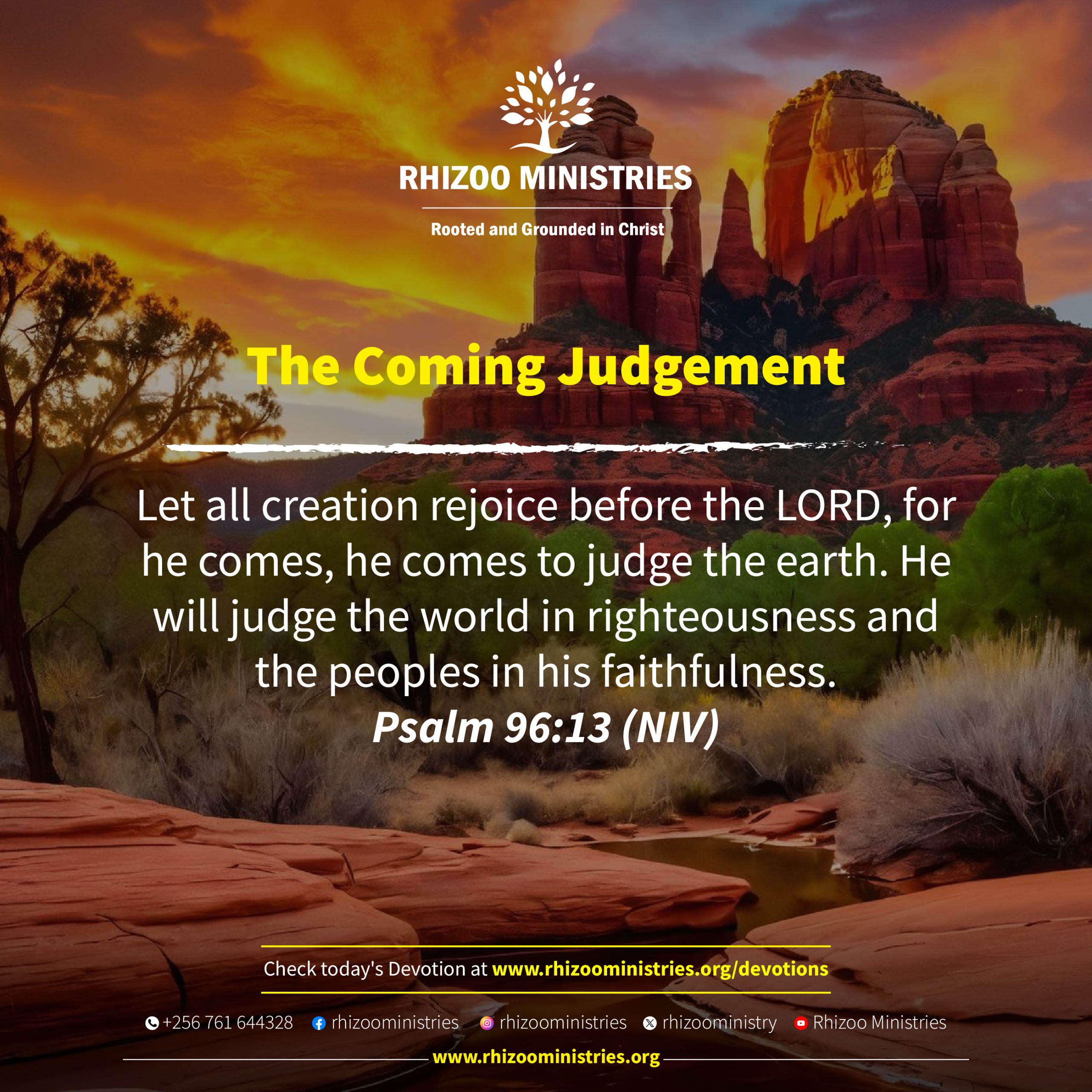 Let all creation rejoice before the LORD, for he comes, he comes to judge the earth. He will judge the world in righteousness and the peoples in his faithfulness. Psalm 96:13 (NIV)