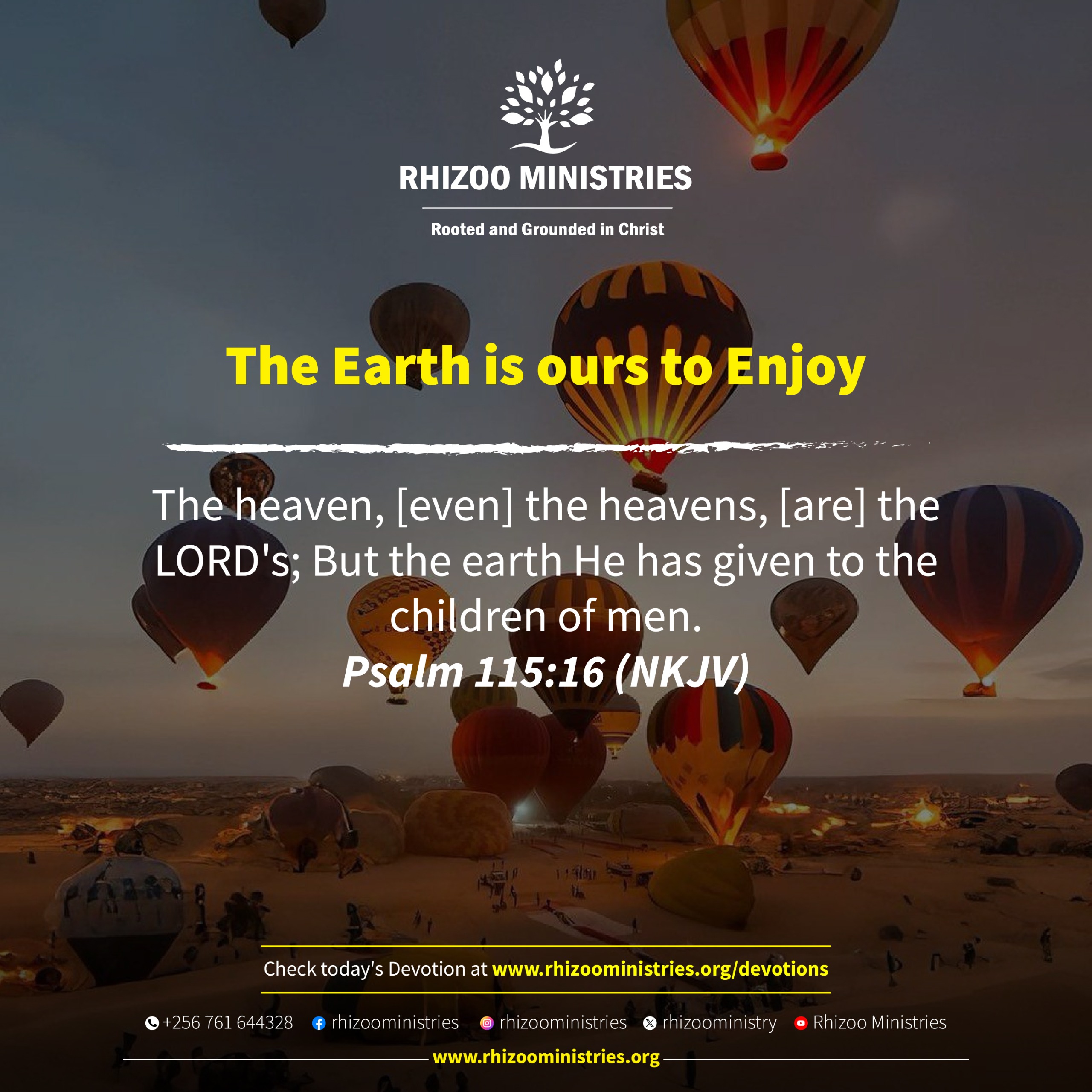 Earth is not for the devil and his demons. God created it and gave it to man. Even though man sinned and permitted the devil to have power on earth, Jesus came and stripped the devil of all his claims on earth.The earth is part of our inheritance in Christ – Galatians 3:29; Romans 4:13 Earth is not for suffering as we endure to go to heaven to enjoy.God loves the earth He created and has promised to restore it to perfect harmony.But even now though the earth just as the rest of creation is experiencing groaning, we can find good and enjoy the earth.The only balance needed is not to think that earthly achievements and possessions are all we have to pursue and live for, but we ought to use earthly resources and advantages to live for God. We live with a heavenly attitude on earth. We find out and walk out God’s purpose for us on earth.