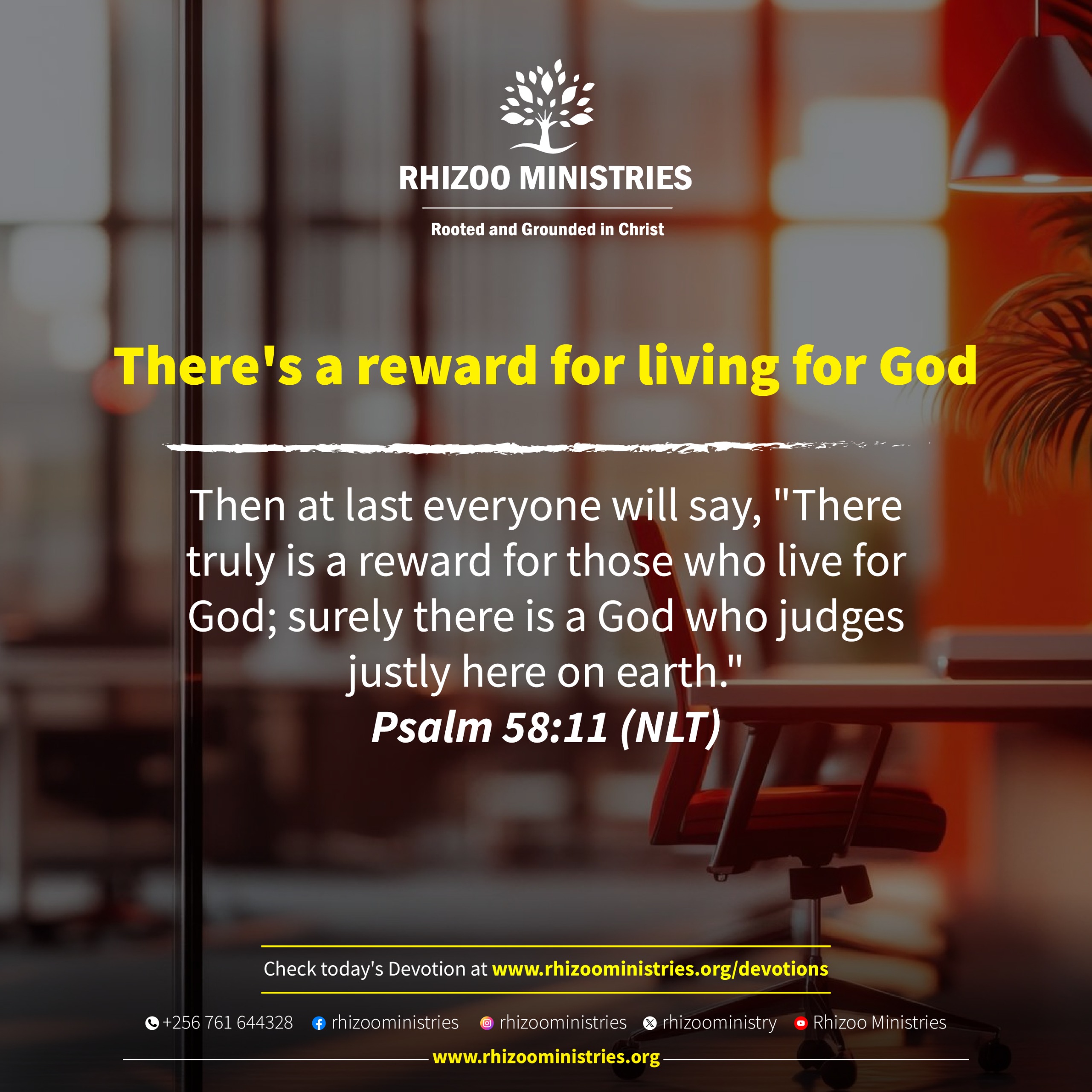 Then at last everyone will say, “There truly is a reward for those who live for God; surely there is a God who judges justly here on earth.” Psalm 58:11 (NLT)