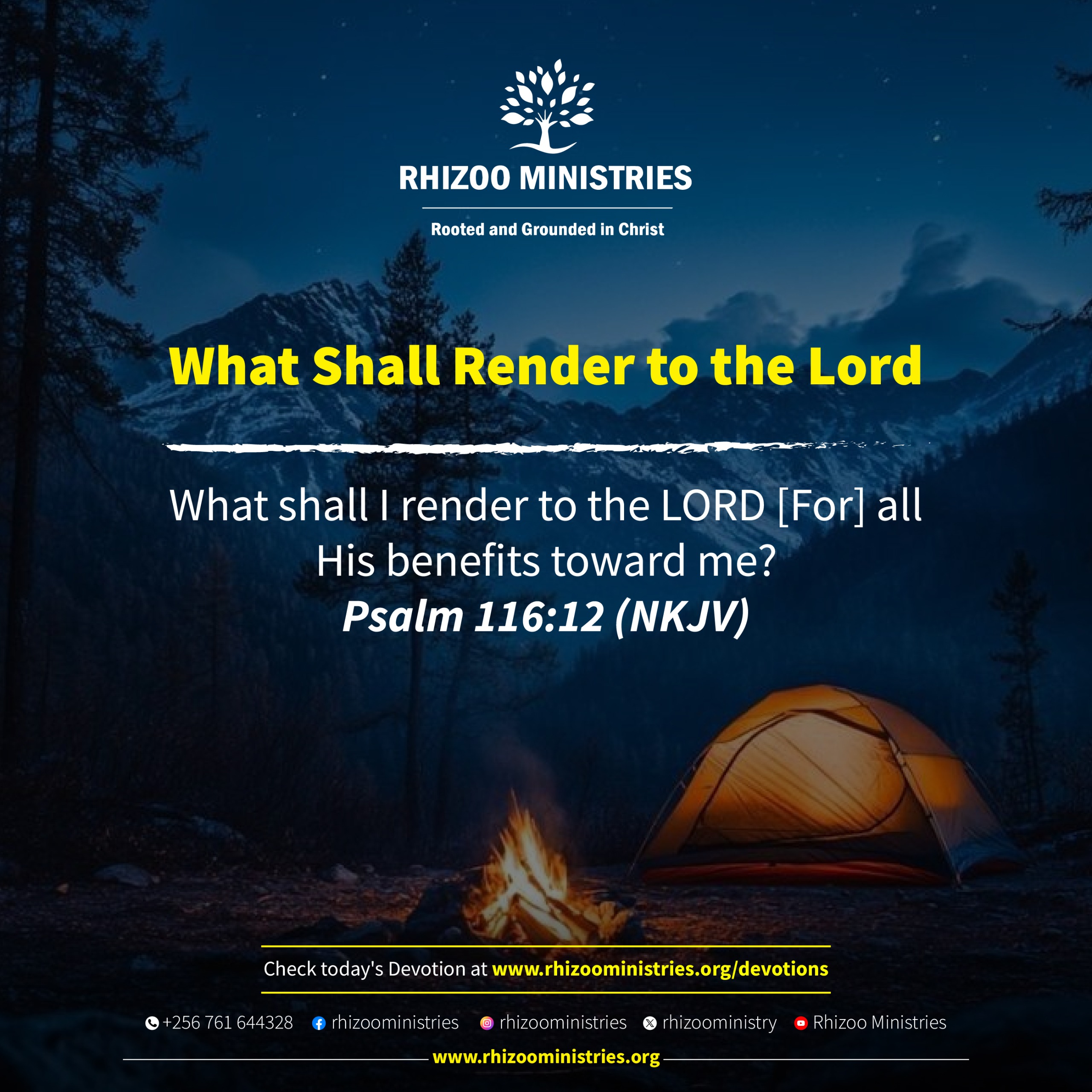 There’s nothing we can offer to God in return for what He gives to us. Because God has freely and graciously given to us.The following verses tell us what the Lord desires and requires from us not as a return but as a grateful and thankful response.Psalm 116:13 (NKJV) I will take up the cup of salvation, And call upon the name of the LORD.Receive and walk in the Salvation He has given you. Salvation includes forgiveness, peace, deliverance, healing, preservation, wholeness, provision.Call upon the Name of the Lord in prayer to Him, worship Him, and look to Him as your source and help.Psalm 116:17 (NKJV) I will offer to You the sacrifice of thanksgiving Always thank God for what He has done Psalm 116:18 (NKJV) I will pay my vows to the LORD Now in the presence of all His people,Be a person of your word, keep your promises.