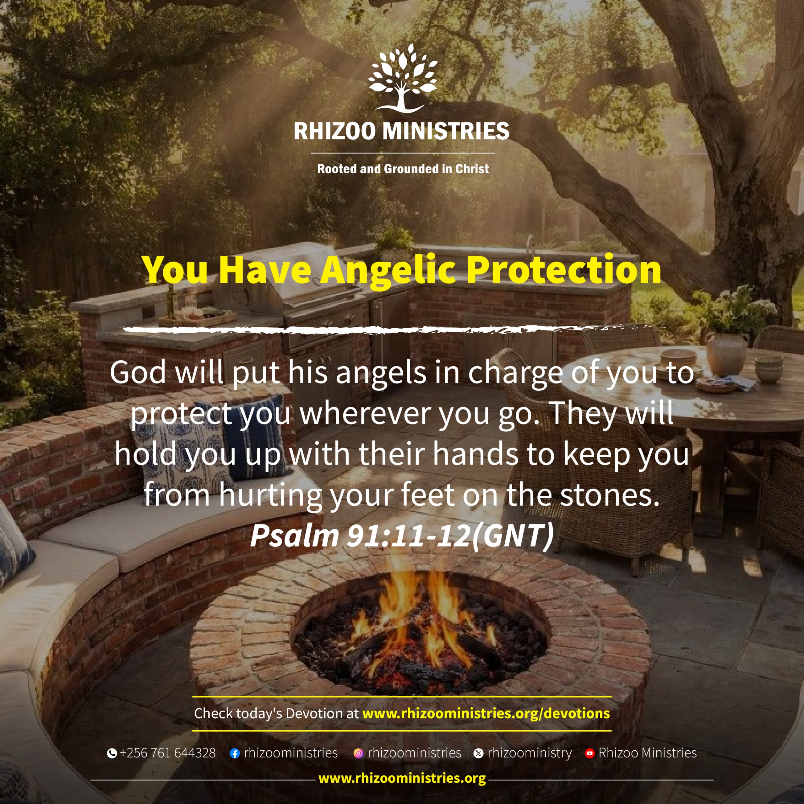 God will put his angels in charge of you to protect you wherever you go. They will hold you up with their hands to keep you from hurting your feet on the stones. Psalm 91:11-12(GNT)